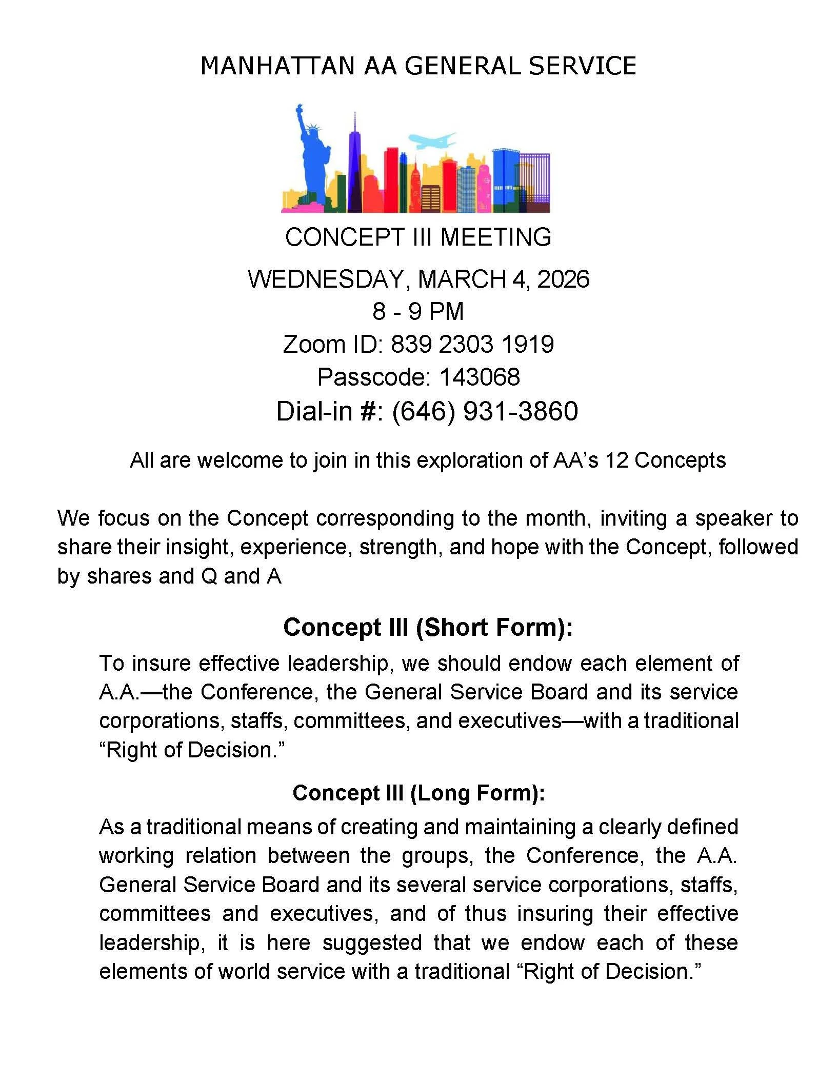 Manhattan General Service Concepts Meeting CONCEPT IIIWednesday March 4, 20268:00 PM – 9:00 PMZoom ID: 839 2303 1919 Passcode: 143068